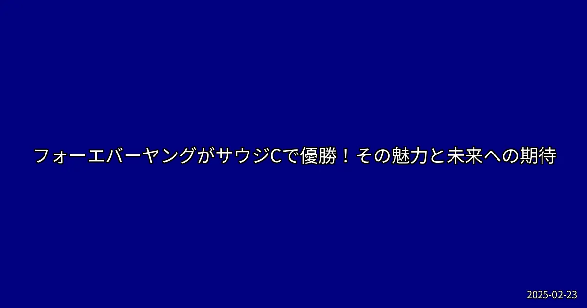 2025年2月23日、フォーエバーヤングがサウジカップで見事に優勝し、その名を世界に轟かせました。このレースは、海外G1初制覇となり、矢作師も「信じられない強さ」と称賛するほどのパフォーマンスでした。今回は、この勝利がもたらす影響やフォーエバーヤングの魅力について掘り下げてみたいと思います。