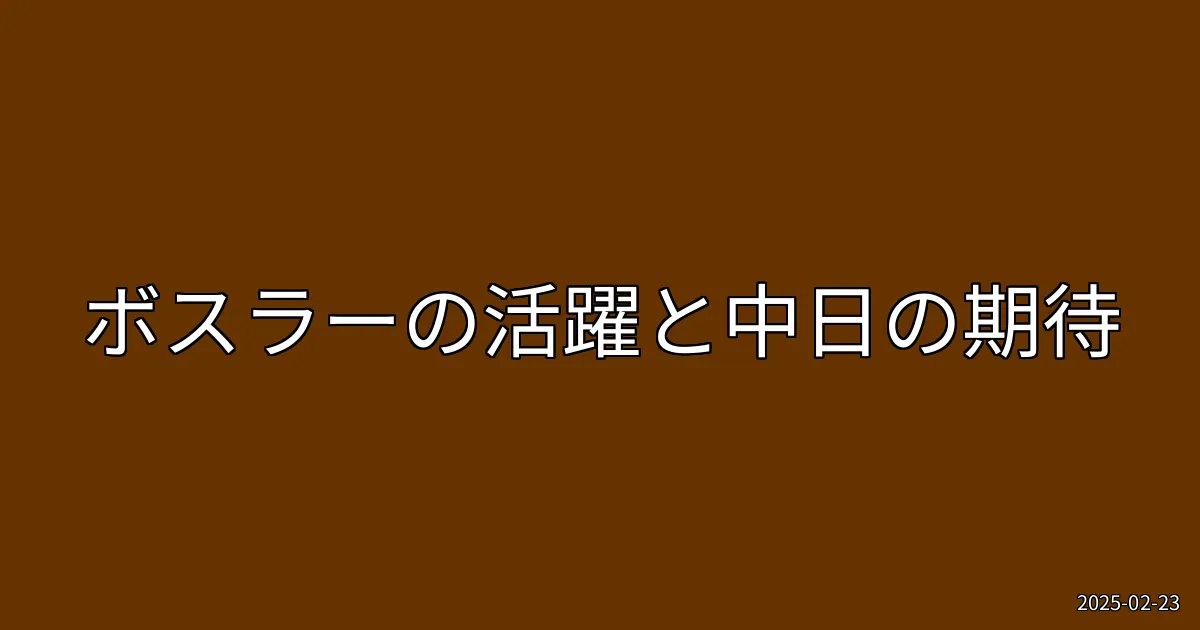 2025年2月23日、中日ドラゴンズの新外国人選手ボスラーが特大の場外ホームランを放ち、ファンの間で話題となっています。特に、このホームランは、阪神の才木からの完璧な3ランであり、球場は騒然としました。ボスラーの活躍は、今季の中日の戦力に大きな期待を寄せる要因となっています。