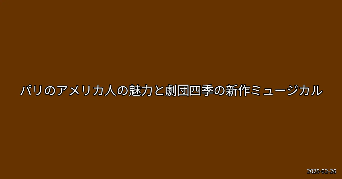 『パリのアメリカ人』は、劇団四季の新作ミュージカルとして多くの期待を集めており、観客に感動と楽しさを提供しています。過去の映画版と比べても、その魅力は引き続き健在であり、今後も注目の作品であることは間違いありません。最新の情報については、ニュースサイトや公式サイトをチェックしてみてください。