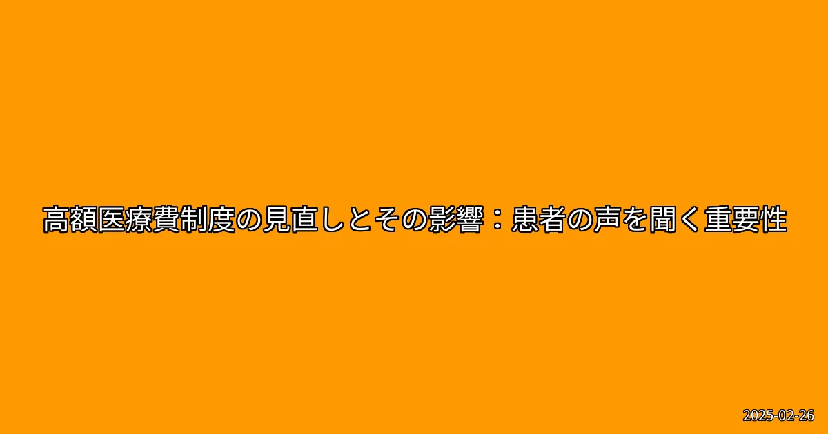 2025年2月26日、現在の日本において「高額医療費制度」が再び注目を集めています。この制度は、医療費が高額になった場合に、自己負担額に上限を設けることで、患者の経済的負担を軽減することを目的としています。しかし、最近のニュースでは、この制度の見直しが議論されており、特に患者団体からの反発が強まっています。